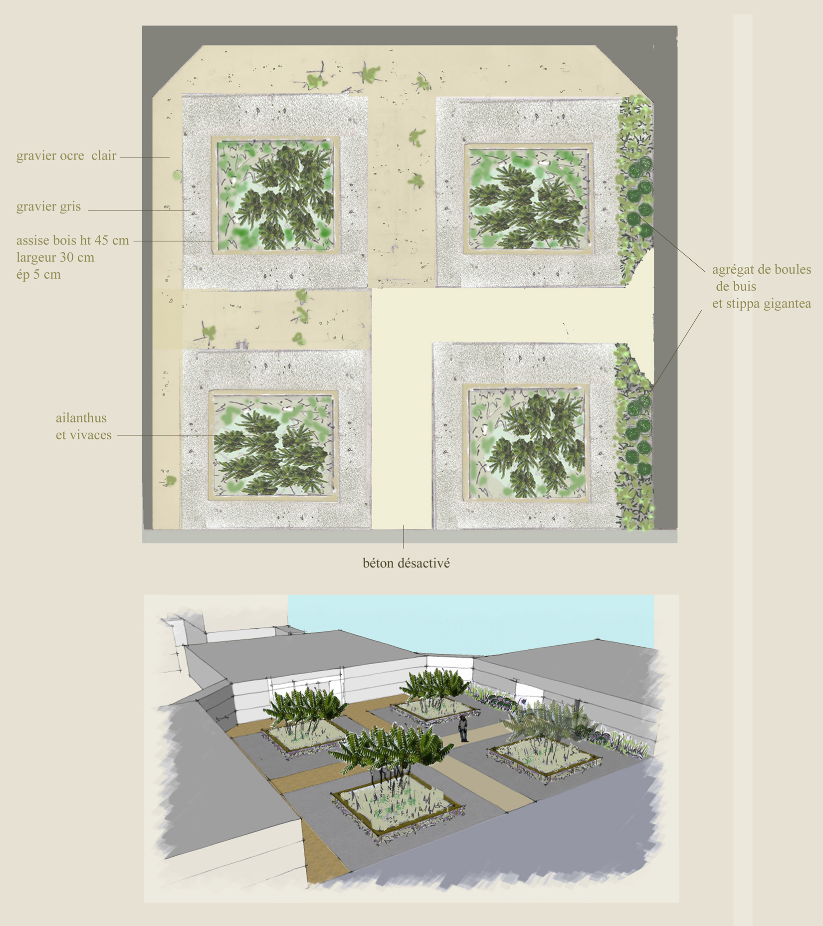 Les pins sylvestres donneront rapidement l’échelle du bâtiment; les charmilles structurent l’espace; les sumacs apportent leur graphisme et leur couleur d’automne; les miscanthus captent la lumière: une végétation sobre pour une architecture contemporaine et dynamique.